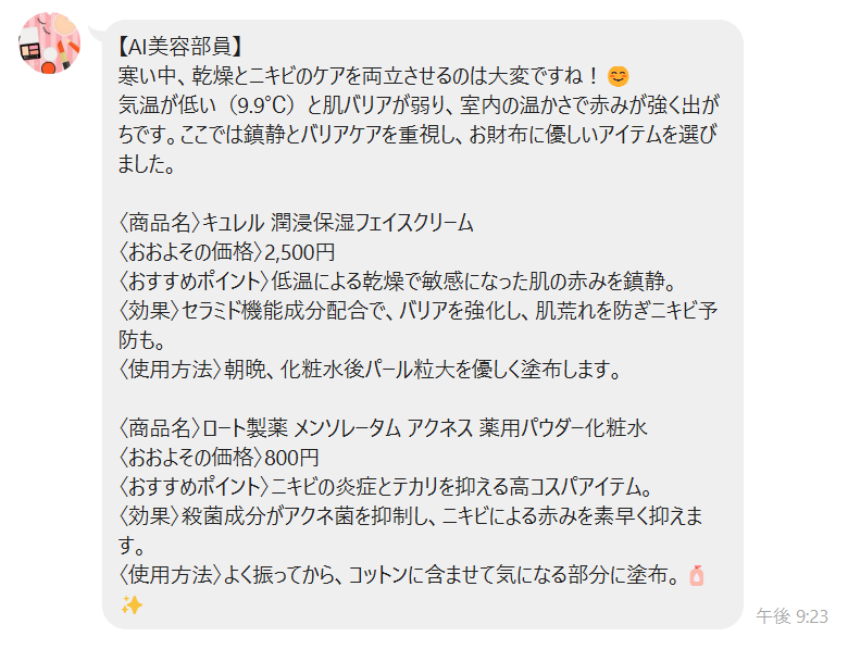近年拡大が続く化粧品市場において、利用者は季節変動や日々の肌コンディションといった多様な要因に基づき、パーソナライズされた製品選定が求められている。この課題に対応するため、私たちはAIを活用した化粧品選定システムを開発した。 本システムは、気象情報、利用者の年齢や肌の悩みに関する情報、および利用者の肌の赤みを数値化したデータの3種類の情報を入力プロンプトとして統合する。このプロンプトに基づき、AIが個々の利用者に最適な化粧品を選出する。