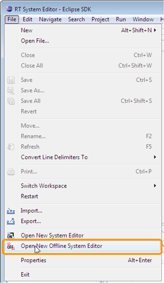 To open a new Offline System Editor, click Open New Offline System Editor in the toolbar, or select Open New Offline System Editor from the File menu.