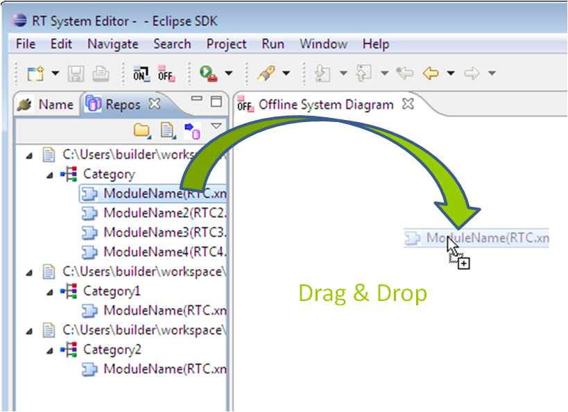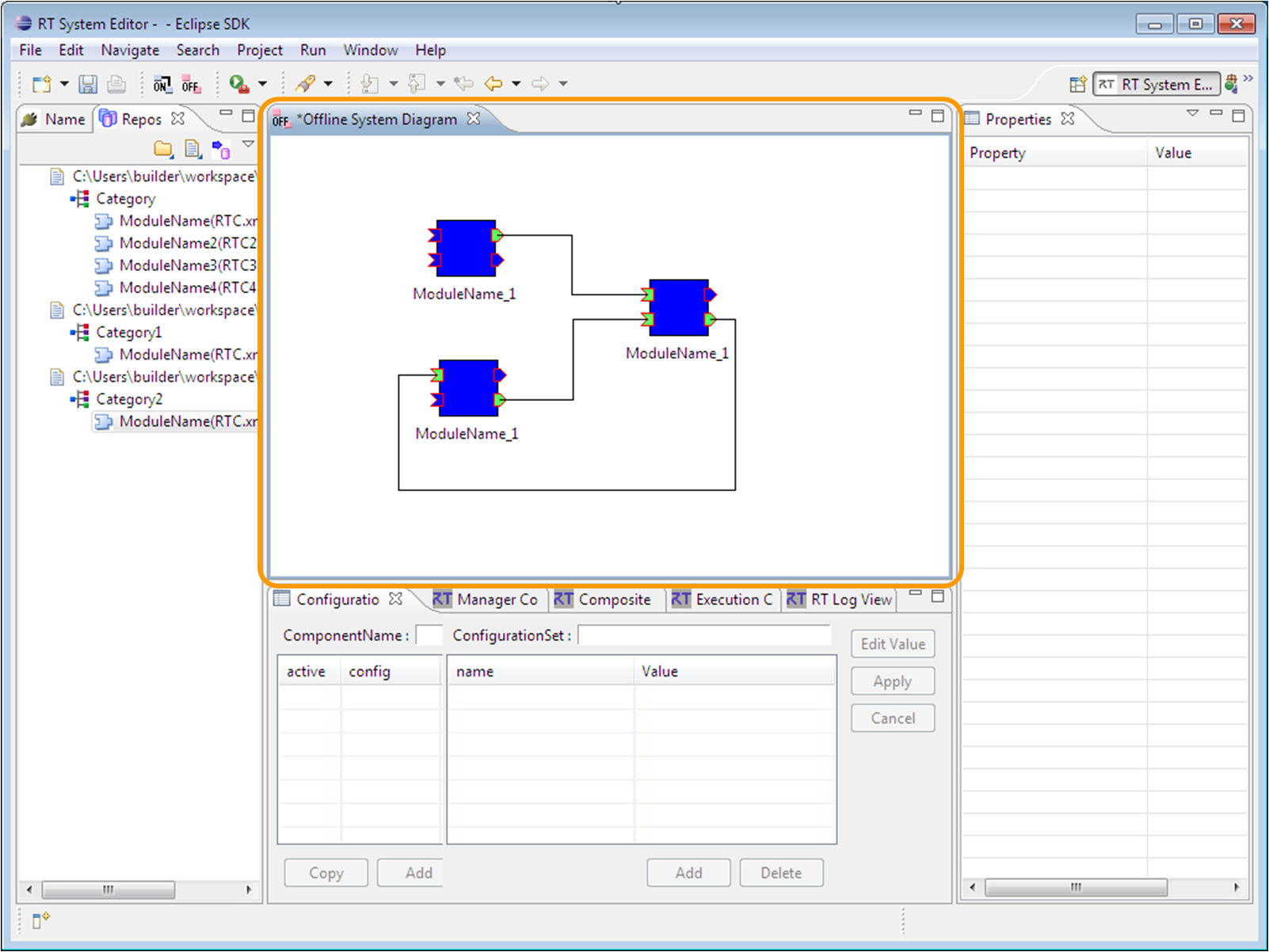 The Offline System Editor allows for creation of RT systems by drag and drop of components from a repository into a system diagram. Its operation is generally the same as the online editor, but the state of RT components cannot be changed, nor will component state information be updated.
