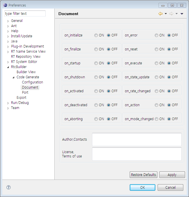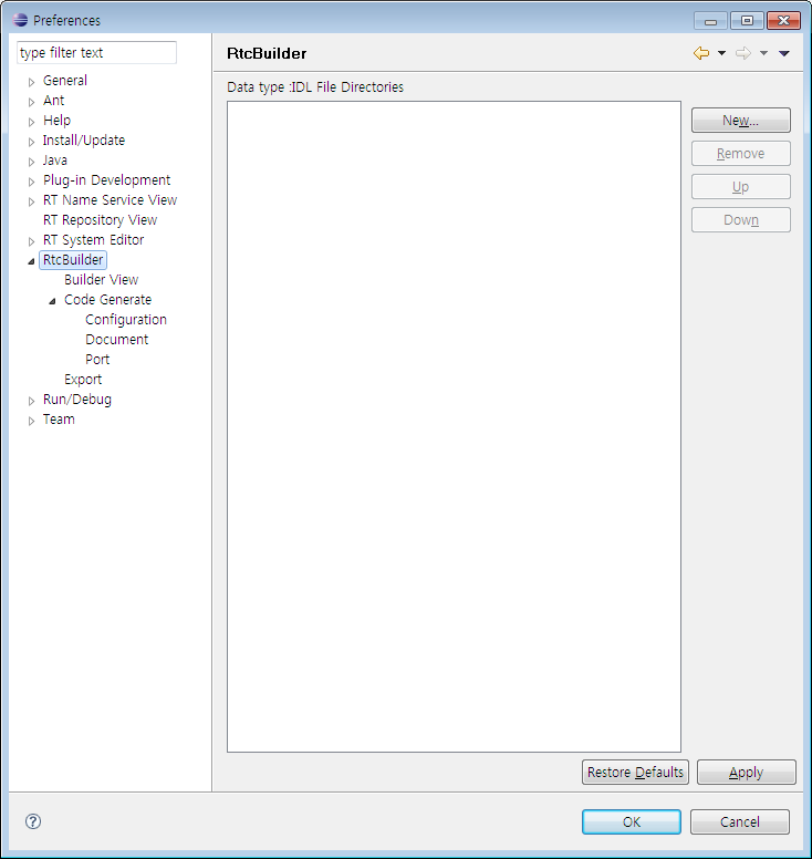 여기에서는 RTCBuilder 의 각종 설정에 대해 설명합니다. RTCBuilder 의 설정 화면은, 화면상부 메뉴의[Window][Preferences]를 선택해 표시되는 「Preferences」화면으로부터「 RTCBuilder 」를 선택하면 표시됩니다.
