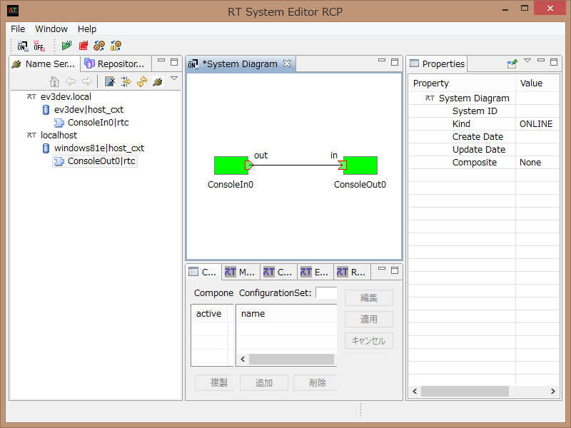 それぞれのネームサーバに ConsoleIn (EV3のネームサーバー) と ConsoleOut (PC側のネームサーバー) が現れるはずので、それぞれエディタにドラッグアンドドロップして、InPort と OutPort を接続、Activate します。