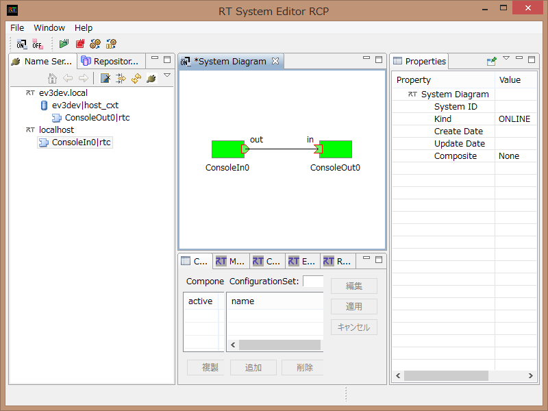 RTSystemEditor上で、ConsoleIn と ConsoleOut を接続し、Activate します。 ConsoleIn側で数値を入力し、ConsoleOut側で表示されれば、テストは成功です。
