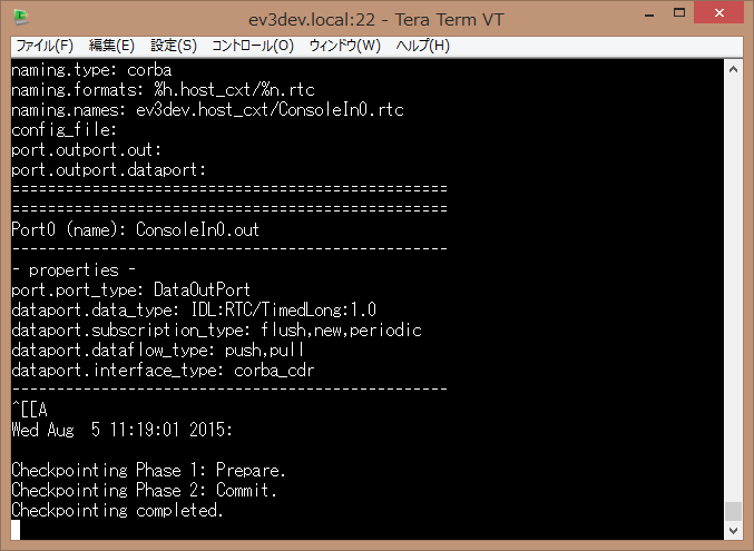 _____ _ _____ _|___ / __| | _____ __ / _ \ \ / / |_ \ / _` |/ _ \ \ / / | __/\ V / ___) | (_| | __/\ V / \___| \_/ |____/ \__,_|\___| \_/ Debian jessie on LEGO MINDSTORMS EV3! :中略 # rtm-naming Starting omniORB omniNames: ev3dev:2809 omniORB: Failed to bind to address 0.0.0.0 port 2809. Address in use? omniORB: Error: Unable to create an endpoint of this description: giop:tcp::2809 :中略 and start omniNames by rtm-naming? (y/N)y ← yを入力 Stopping omniNames by /etc/init.d/omniorb4-nameserver. [ ok ] Stopping omniorb4-nameserver (via systemctl): omniorb4-nameserver.servic. Starting omniORB omniNames: ev3dev:2809 Wed Aug 5 11:04:01 2015: Starting omniNames for the first time. Wrote initial log file. Read log file successfully. Root context is IOR:010000002b00000049444c3a6f6d672e6f72672f436f734e616d696e672f4e616d696e67436f6e746578744578743a312e30000001000000000000007400000001010200100000003139322e3136382e3132382e31303400f90a00000b0000004e616d6553657276696365000300000000000000080000000100000000545441010000001c000000010000000100010001000000010001050901010001000000090101000354544108000000a1edc1550100028f Checkpointing Phase 1: Prepare. Checkpointing Phase 2: Commit. Checkpointing completed. omniNames properly started root@ev3dev:~#次に、ConsoleInComp を起動します。