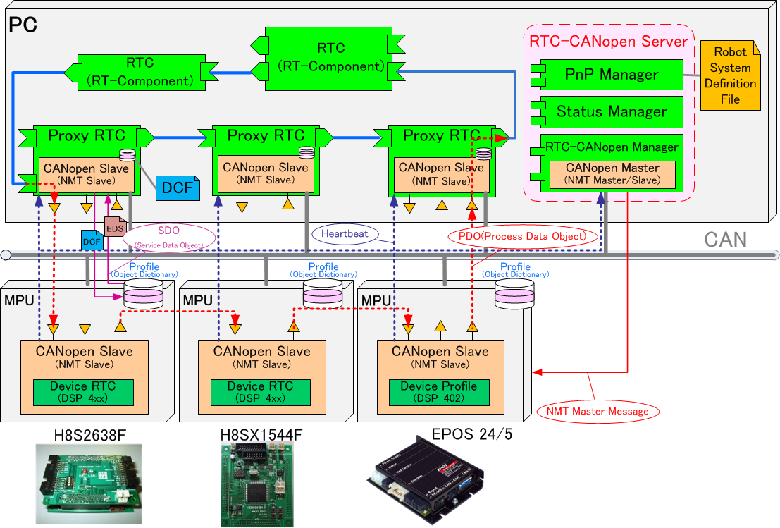 RTC-CANopenとは、安全バスシステムとして広く使用されているCANopenの特徴を取り入れた組込み向けのRT-Middlewareです。 RTC-CANopenは、ネイティブバスであるCANを介して接続される各種デバイスと汎用PC上のEthernetで接続されるデバイスやアルゴリズムと相互に接続することが可能となっているうえに、PnP機能をサポートしており柔軟なロボットシステムの構築が可能です。 RTC-CANopenはRenesas社製のSHシリーズ、H8SXといったマイコンやMaxon社製EPOSなどのCANopen準拠製品に適用することが可能です。