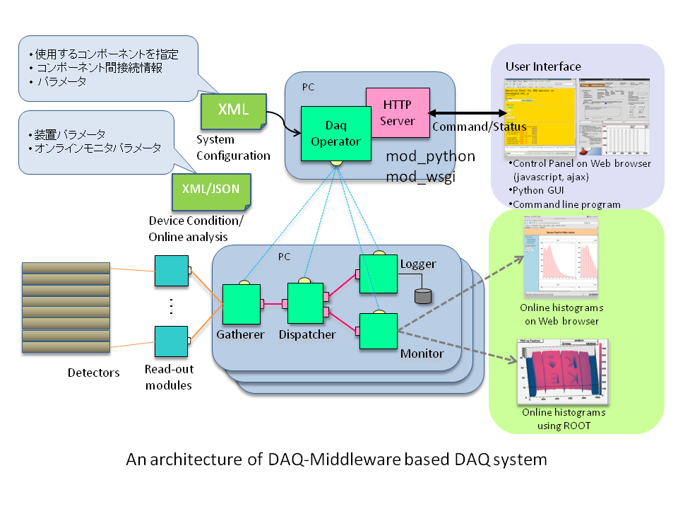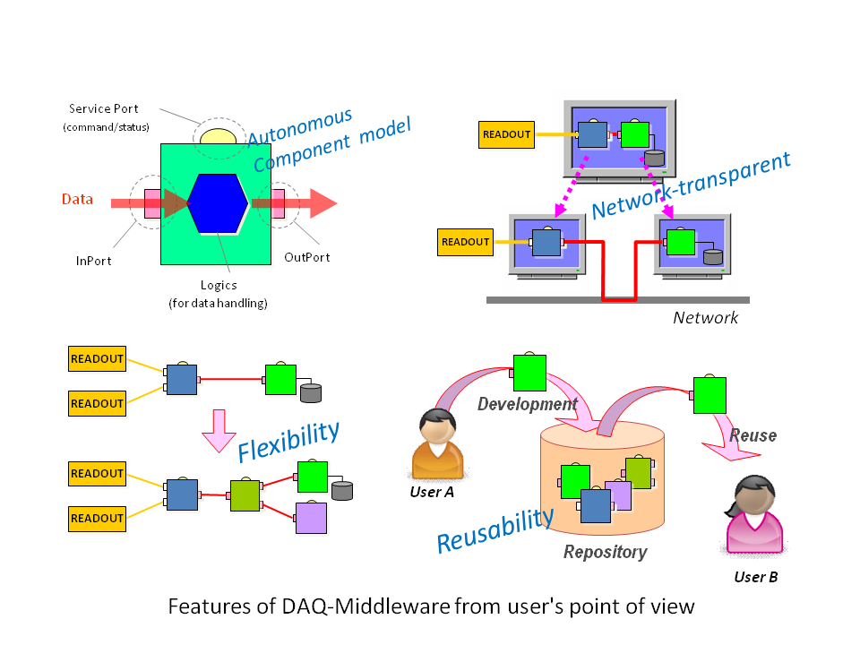 DAQ-MiddlewareはOpenRTM-aistを基盤とした高エネルギー加速器研究機構(KEK) や大強度陽子加速器施設(J-PARC)等の実験データ収集システム(DAQシステム)で 使用するためのソフトウェアフレームワークです。 RTコンポーネントを拡張したDAQコンポーネントによる汎用で柔軟なDAQシステム 構築をめざしています。 現在J-PARCの物質・生命科学実験施設(MLF)の複数の実験装置で稼働中の他、 各種検出器テストベンチとして使われています。