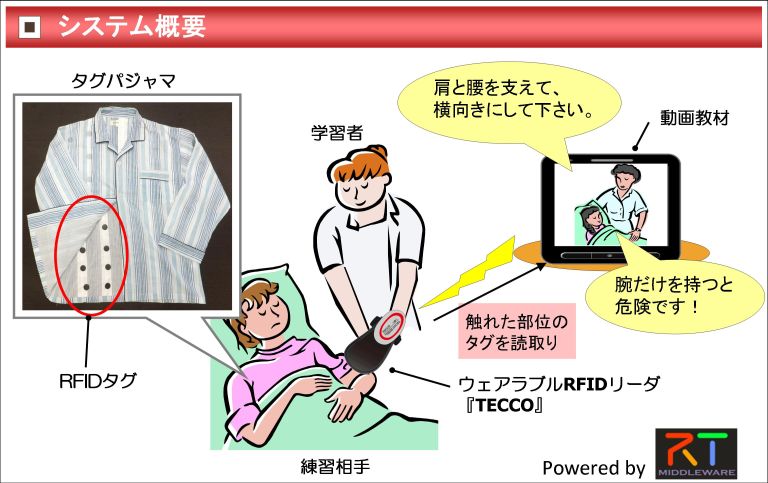RFIDタグを活用した看護ケアスキルの教育支援システムを提案する。今回は特に、体位変換(患者の寝ている方向を変えるなど)の学習を題材にする。学習者がウェアラブルRFIDリーダ『TECCO』を装着し、タグが縫い込まれたパジャマを練習相手が着ることにより、学習者が練習相手のどの部位に触れたかが検知可能となる。この情報をもとに、学習者の動作と動画教材を連動させることで、インタラクティブな学習が可能となる。今回、TECCOと動画教材の連動の部分をRT-ミドルウェアにて実現した。