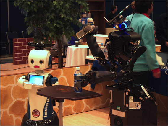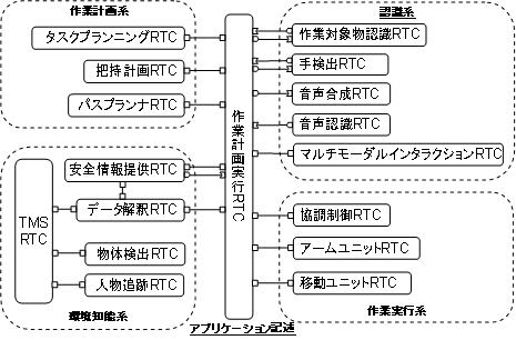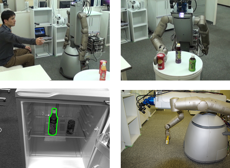 ロボットシステムに必要とされる環境認識やヒューマンインターフェース,作 業計画といった機能を持つ作業知能モジュール(RTコンポーネント)群を再利用 可能な部品として開発し,これらのRTコンポーネントを組み合わせて社会・生活 分野向けのロボットシステムを構築しました. 更に,このロボットシステムを用いて,人からの音声や指差しによる指示でペッ トボトル等の日用品の取り寄せや片付けの作業を行うアプリケーションを開発 し,これらの作業を行えることを確認しました.