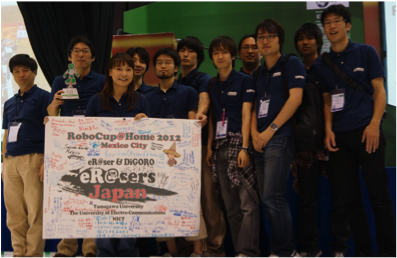 ロボカップ@ホームリーグでは家庭において,人とコミュニケーションを取りながら働くロボットの実現を目指している。純粋にロボット技術だけを競うのではなく,実用性を重視した競技であり,動作の信頼性・安全性も評価の対象となるため,競技は新規環境でも基本的に一発勝負であり,再試行は減点の対象となる。ロボットシステムの開発には,開発環境や制御技術などの面で大変な労力が必要となる.そこで,我々は,共通化,効率化を実現する手段として,RTミドルウェアに注目した。RTC を再利用して組み合わせることで,タスクに対応したロボットシステムを容易に構築できることを示し、RoboCup2013世界大会(メキシコシティ)において準優勝を獲得した。