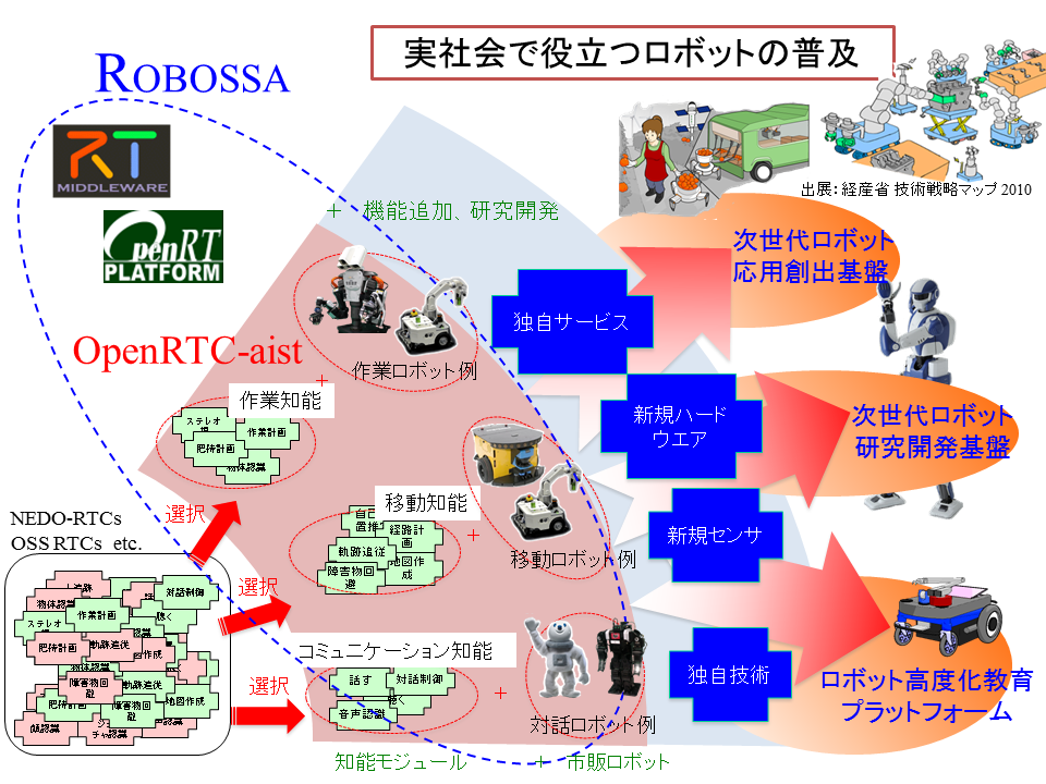 ROBOSSAは、RTミドルウェア(OpenRTM-aist)とその開発ツール(OpenRTP-aist)、オープンソースライセンスによる「作業知能」、「移動知能」、「コミュニケーション知能」の各知能モジュール群(OpenRTC-aist)の総称です。