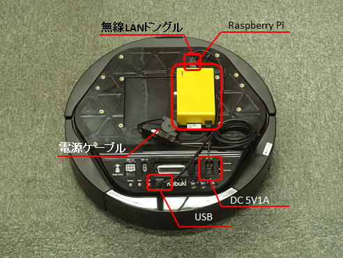 Kobuki 動作時に脱落する可能性がありますので、Raspberry Pi はマジックテープなどで固定するとよいでしょう。