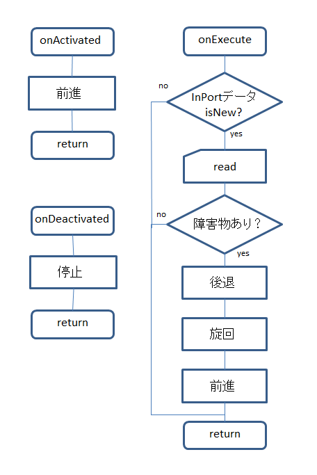 InPort にデータが来ていたら、データを読み込みバンパ情報を取り出します。バンパ情報は、TimedBoolSeq というデータ型の .data という配列のメンバに格納されており、上の表で0,1,2番目の要素であることがわかります。 これらのどれかが true になっていたらバンパで衝突を検知したということですから、いったん下がり、旋回します。そして、再び前進します。 これらの動きを TimedVelocity2D のメンバーにそれぞれ設定して OutPort に writeすれば、速度指令データは Kobuki に伝達されます。 アルゴリズムのフローチャートを下に示します。