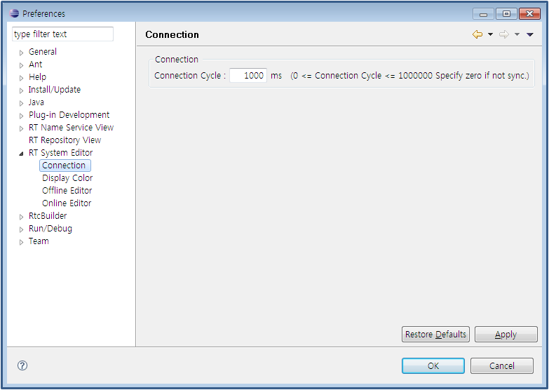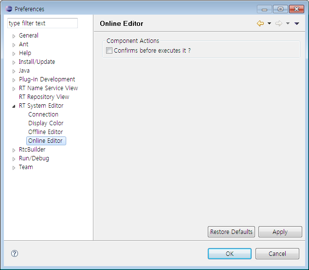 여기에서는, RT System Editor 의 설정 화면에 대해 설명합니다. RT System Editor 의 설정 화면은, 메뉴의 [window]-[preferences…]-[RT System Editor] 로 표시할 수 있습니다.