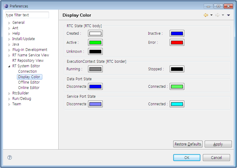 표시색 설정 화면에서는, 시스템 에디터에서 표시되는 RTC와 ExecutionContext 상태의 색을 설정할 수 있습니다. 각각의 상태의 의미에 대해서는,시스템 에디터의 RTC의 표시를 봐 주세요.