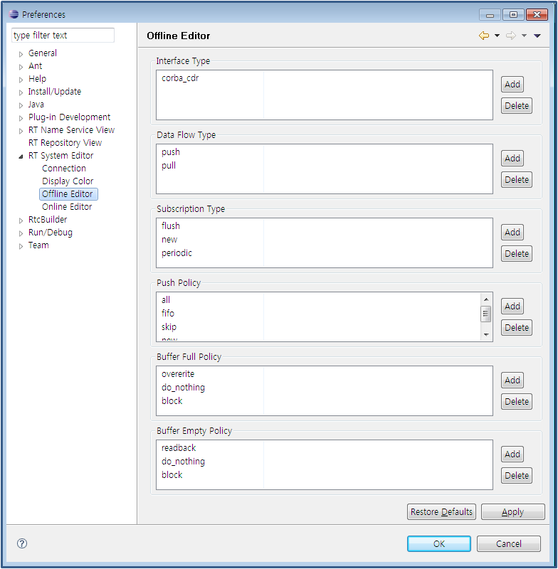 오프 라인 에디터로 포트 접속시에 선택할 수 있는 파라미터를 설정할 수 있습니다.설정 가능한 항목은 「Interface Type」, 「Data Flow Type」, 「Subscription Type」로, 포트 접속시에 여기서 설정한 파라미터로부터 값을 선택할 수 있습니다. 각각의 의미에 대해서는 데이터 포트간 접속을 참조해 주세요.