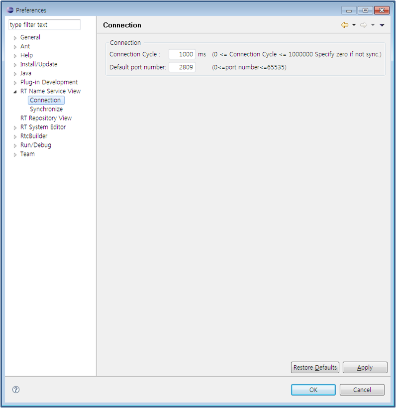 접속 주기란, RT Name Service View가 시스템의 정보를 수집해 표시에 반영하는 주기입니다. 단위는 밀리 세컨드로, 0을 지정했을 경우에는, 동기가 행해지지 않습니다. 디폴트 포트 번호에는, Name Service포트 번호의 디폴트 값을 지정합니다.